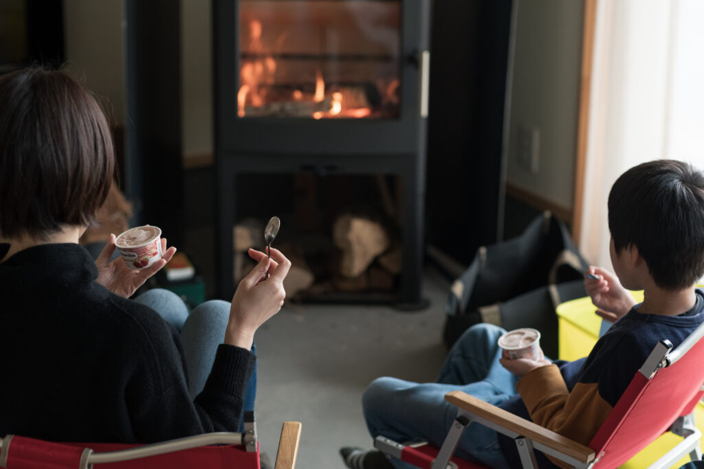 1日の終わりには、お風呂を早く出た人からストーブを囲んでアイスリームを食べる。
