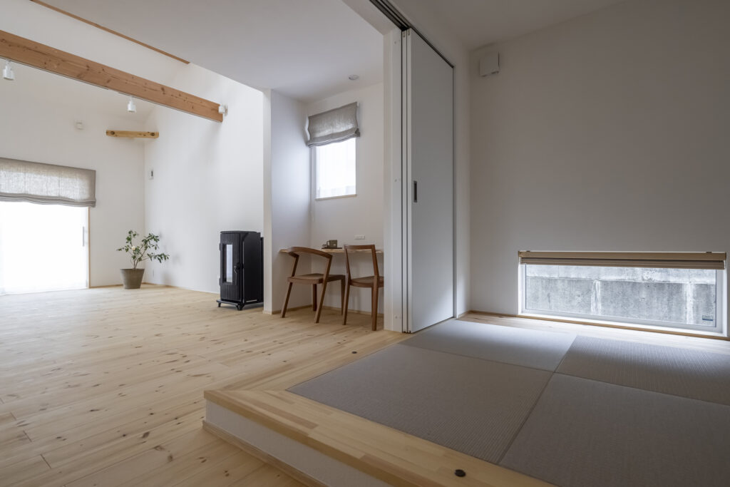 小上がりになった和室。扉でLDK…